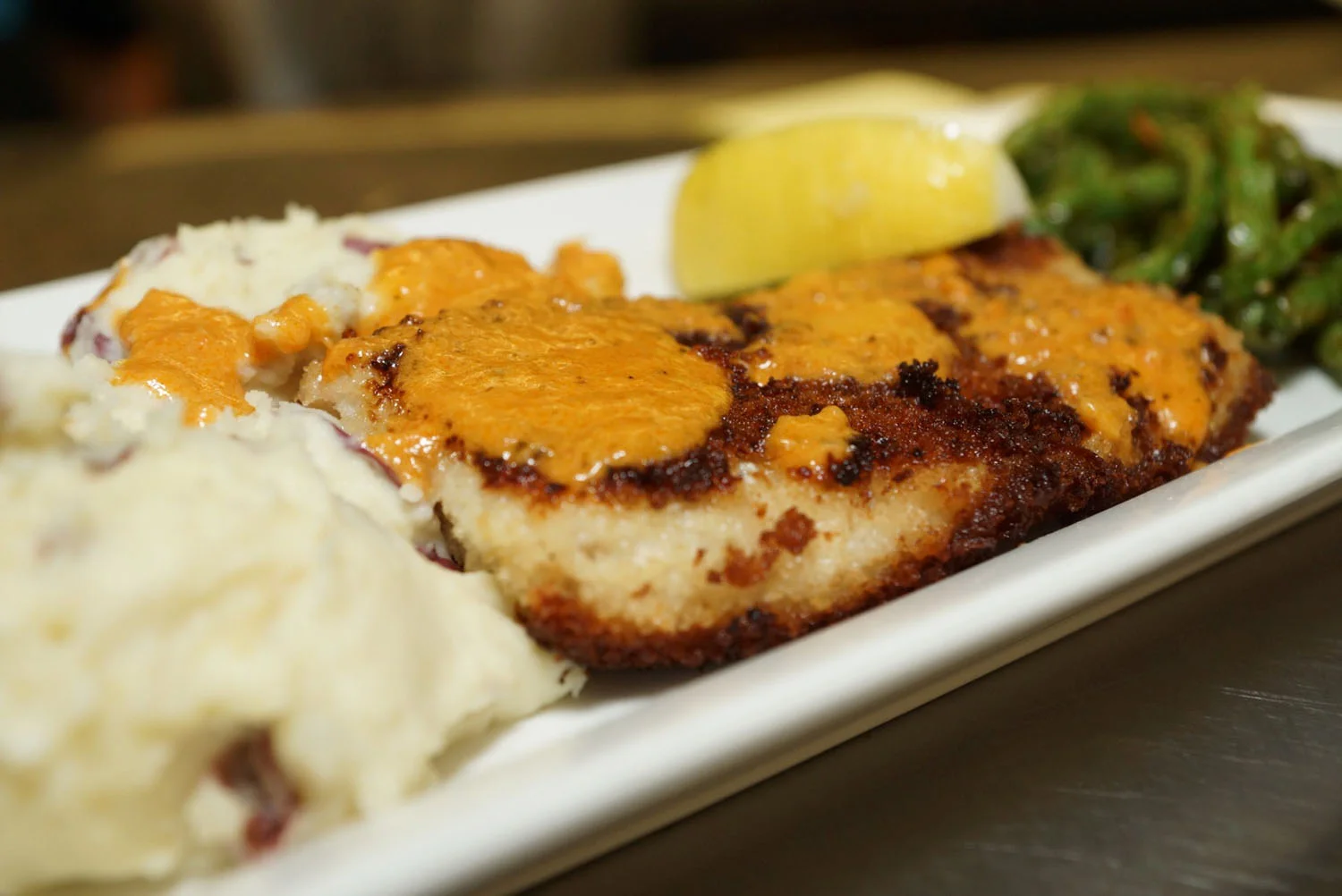 Panko-crusted walleye, pan seared, topped with a roasted pepper butter and toasted almonds.